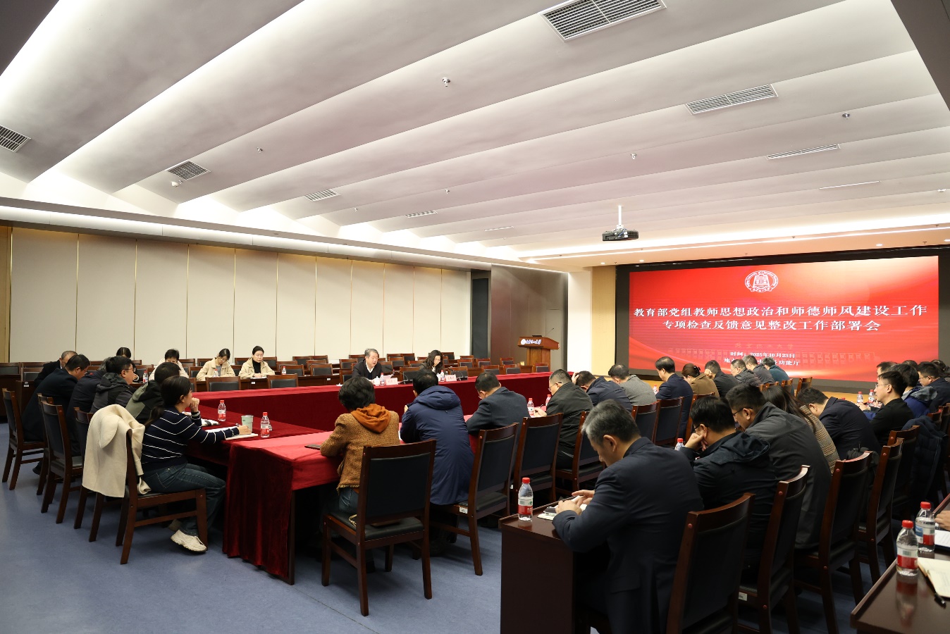 近日,学校召开教育部党组教师思想政治和师德师风建设工作专项检查反馈意见整改工作部署会。校党委书记刘贵芹主持会议并讲话。校党委副书记崔春花传达教育部党组教师思想政治和师德师风建设工作专项检查反馈意见。